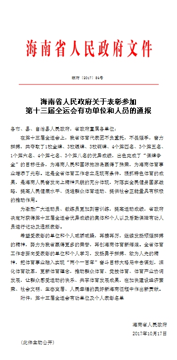 近日,海南省人民政府发布关于表彰参加第十三届全运会有功单位和人员的通报,决定对获得第十三届全运会优异成绩的集体和个人以及后勤保障有功人员进行记功及通报表彰。其中公司体育部黄丽莎老师作为群众体育项目羽毛球教练员获得个人表彰,记个人二等功。