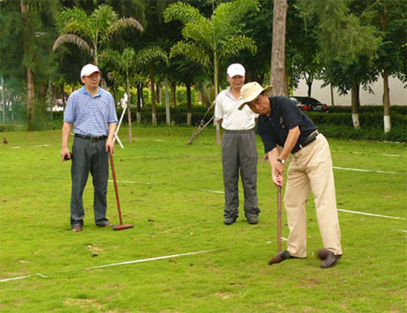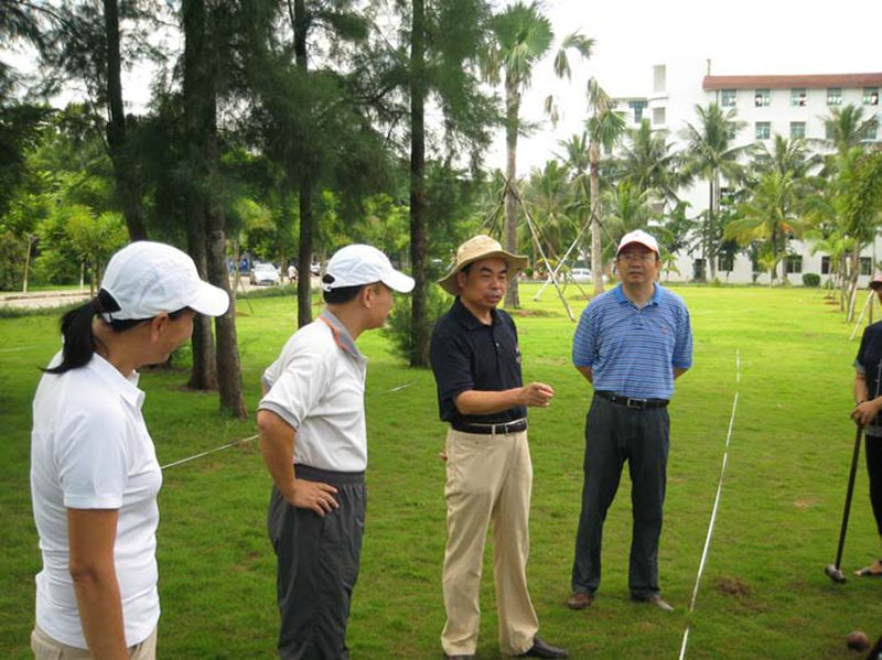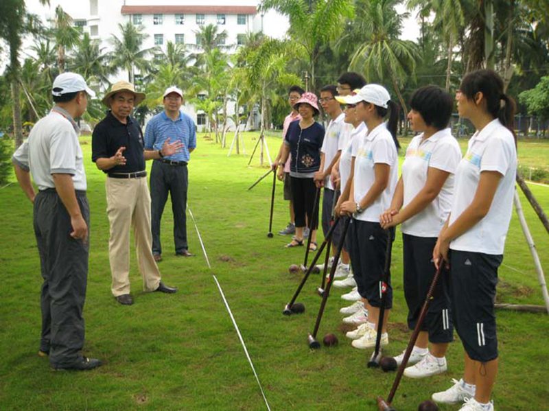 木球是海大的特色运动项目,已有十几年的发展历程,公司木球队在历年国内、国际赛事中,一直保持国内领先水平。今年7月公司木球队在山东举行的两个全国木球赛中取得了院校组男、女团体第一名和4项个人第一名,受到国家体育总局的商请,即将于今年12月代表国家赴阿曼马斯喀特参加第二届亚洲沙滩运动会。8月29日上午,公司党委刘康德书记和傅国华副董事长亲临公司“金桥”木球场现场,为即将代表国家出征的海大木球队加油、鼓劲,并与木球队员一起体验木球运动。