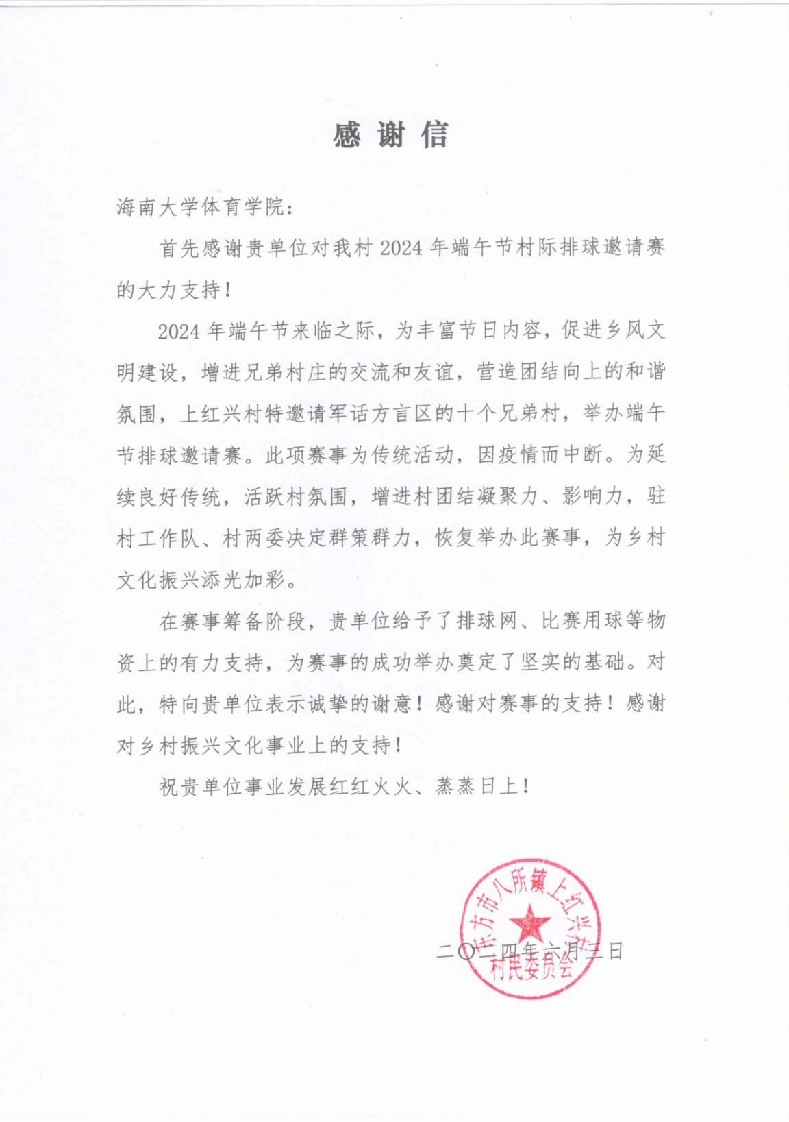 上红新村在感谢信中特别强调了对伟德国际1946的感激之情,感谢伟德国际1946对乡村文化振兴的有力支持。伟德国际1946的这一举措,不仅丰富了乡村的文化生活,更激发了村民们对体育运动的热爱和参与热情,为乡村文化建设注入了新的活力。