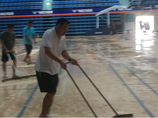 公司安排吴强副经理等三人在公司值班。台风期间,体育馆地下室出现积水,严重危及体育馆空调、机房等大型设备的安全。在这危急时刻,陈卫东书记和洪家云经理果断指示,吴强副经理带领值班人员克服重重困难,充分利用备用发电机及抽水机,轮流值班抽出地下室积水,为保护公司财产立下汗马功劳。